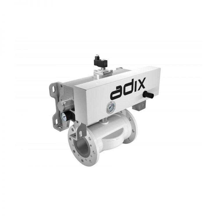Válvula de aislamiento activo de explosiones. En caso de explosión, el detector de presión o de llama activa el cierre en milisegundos de la válvula de estrangulamiento “pinch” mediante el accionamiento de una electroválvula,evitando la propagación de la explosión al resto de la instalación.